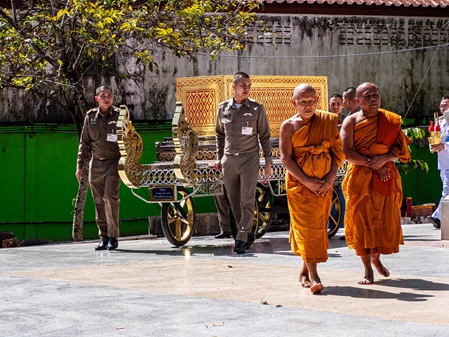 Anschliessend wir der Sarg Richtung Krematorium getragen und die nahen Verwanden verabschieden sich einzeln von der Toten und übergeben jedem der neun Mönchen ein neues Gewand.Es ist kaum zu glauben, aber in der Zwischenzeit ist es bereits 15 Uhr. Geschlagene 5 Stunden beobachten wir das Ritual und sind von den vielen Eindrücken einfach überwältigt. Müde verabschieden wir uns von Mister Choombhon und holen unseren Mittagschlaf nach.